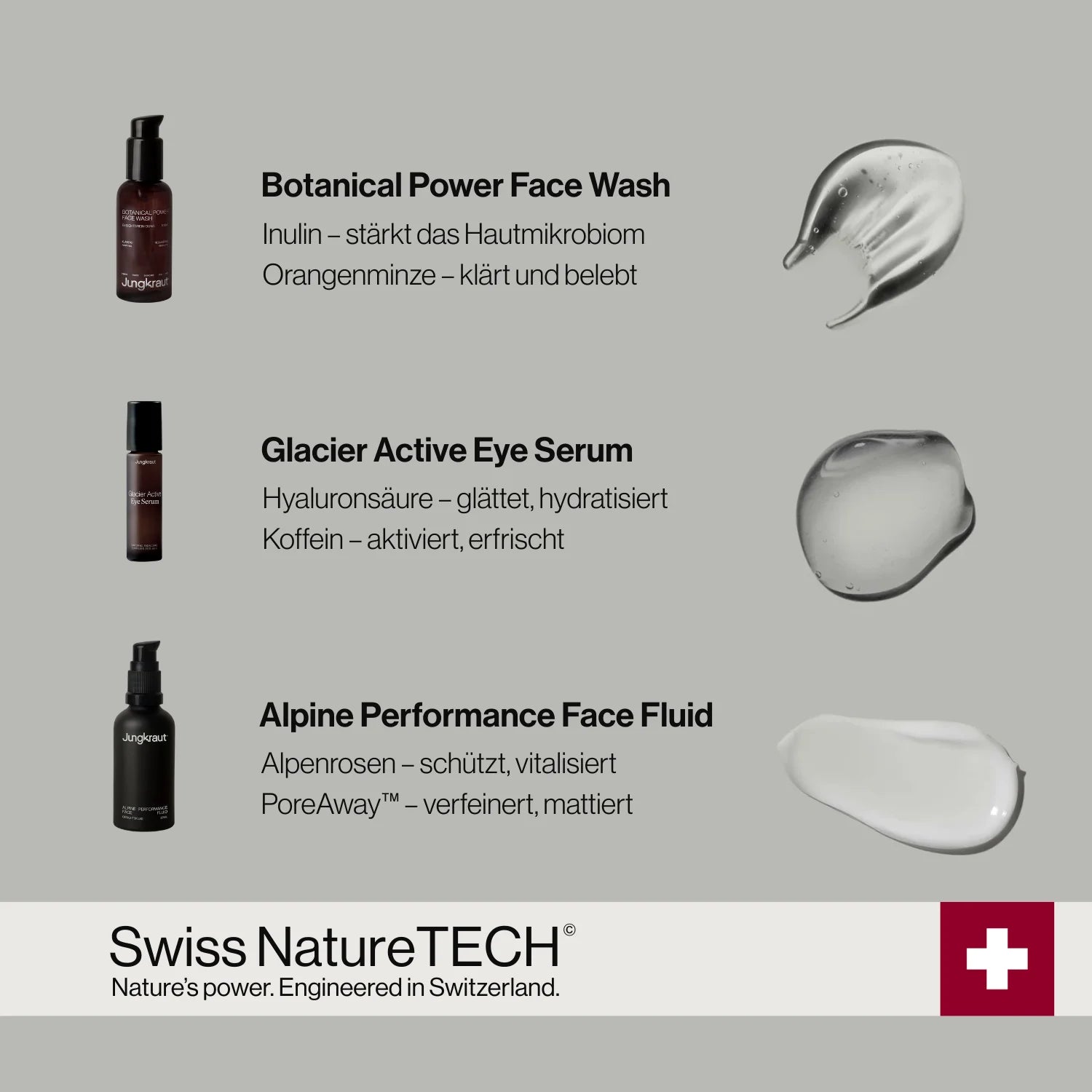 Wenn du die Swiss Essentials Face Solution wie empfohlen täglich anwendest, begleitet dich das Set für mehrere Monate. Das Botanical Power Face Wash (100 ml) reicht bei täglicher Anwendung für rund 3 Monate. Das Alpine Performance Face Fluid (50 ml) ist ebenfalls für ca. 3 Monate ausgelegt. Das Glacier Active Eye Serum (10 ml) ist besonders ergiebig – eine tägliche Anwendung reicht für etwa 8 Monate. Kurz: Deine Gesichtspflegeprodukte für Männer liefern dir nicht nur starke Ergebnisse, sondern auch eine langfristige Wirkung und spürbare Wertigkeit. Dein Investment rechnet sich schnell – Tag für Tag.